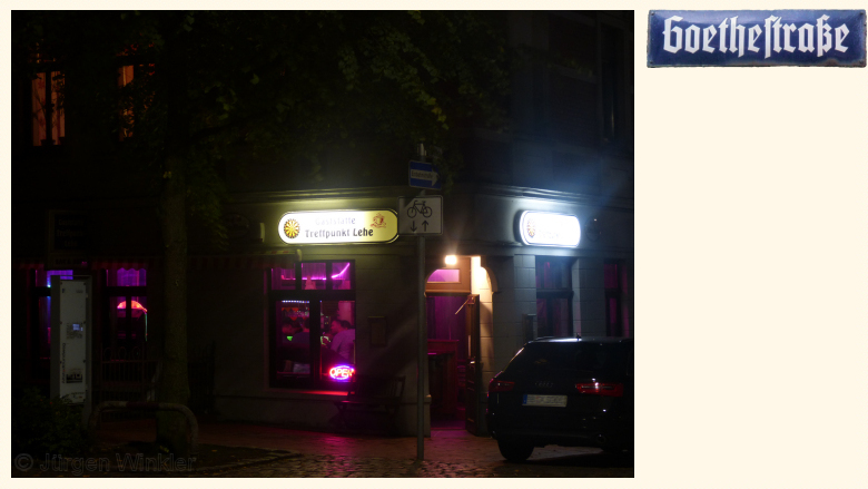 Die ehemalige Eckkneipe "Treffpunkt Lehe" bei Nacht.