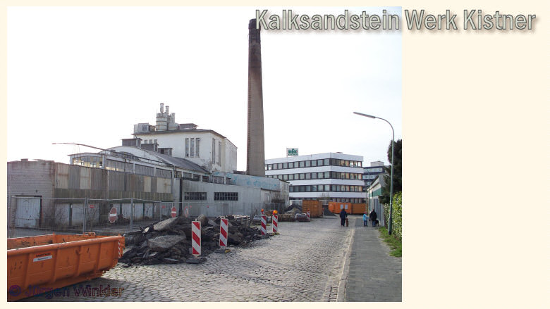 Das Kalksandsteinwerk von der Werftstraße aus gesehen mit Blick in Richtung Hafenstraße. Im Hintergrund steht das Verwaltungsgebäude der Firma Kistner. Links vorne ist die Autoklavenhalle mit den Toren für die Durchfahrt der