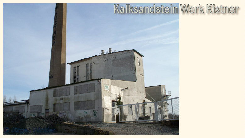 Das Kalksandsteinwerk von der Werftstraße aus gesehen mit Blick in Richtung der Geeste. Auf dieser Seite des Fabrikschornsteins ist der Name der Firma Kistner zu sehen.